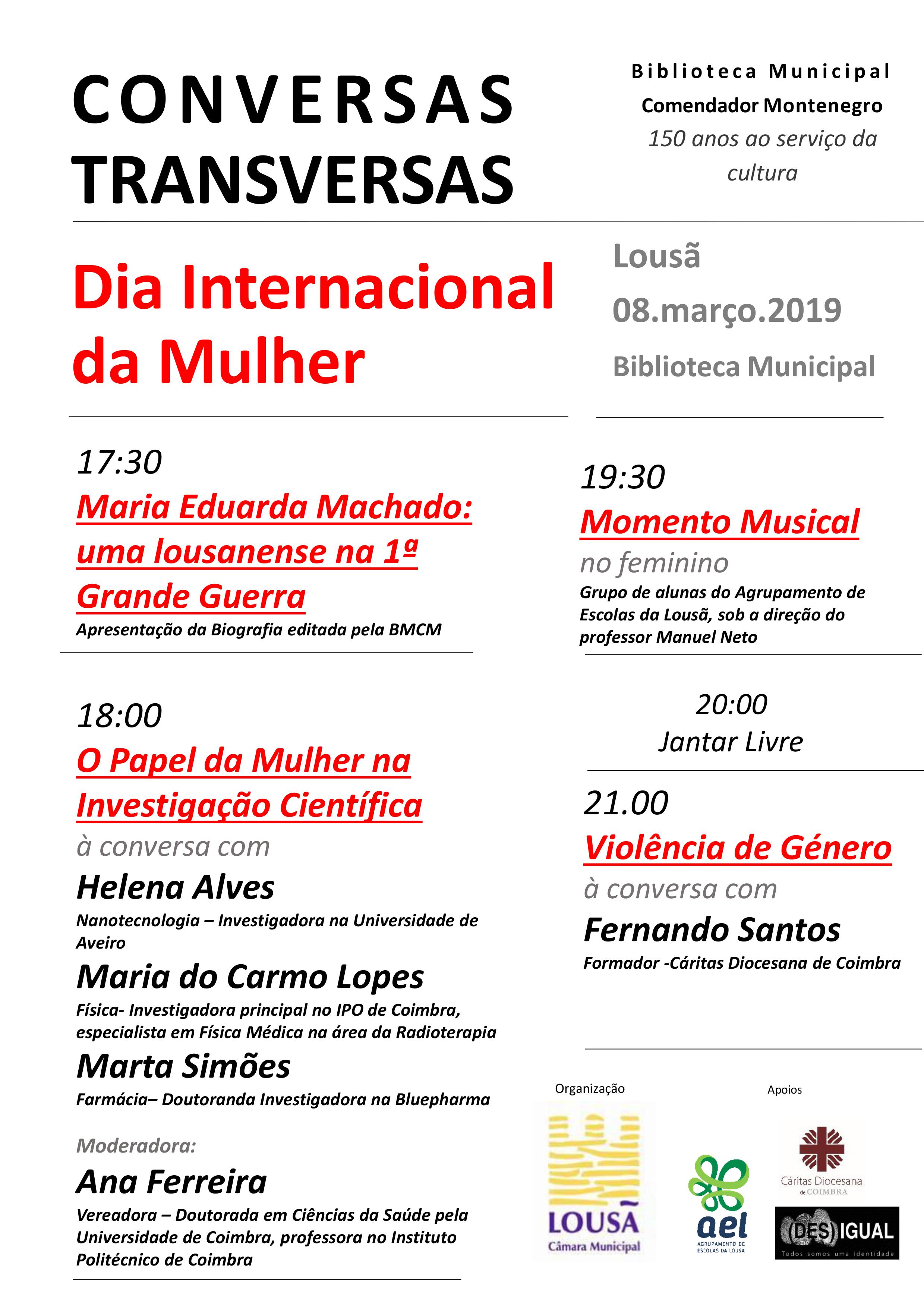 A Câmara Municipal da Lousã irá promover, no próximo dia 8 de março, na Biblioteca Municipal Comendador Montenegro, uma nova edição das “Conversas Transversas”, desta vez dedicadas ao Dia Internacional da Mulher, com um conjunto de atividades articuladas entre os setores da Cultura, da Educação, da Intervenção Social e Saúde e da Juventude, em parceria com o Agrupamento de Escolas da Lousã e com o projeto (des)igual da Cáritas Diocesana de Coimbra.